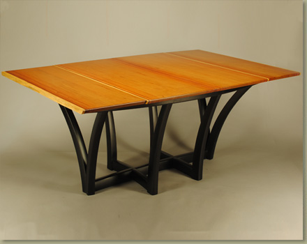 Pau Rosa, ebonized maple pedestal. Butterfly leaf. 45" wide x 80"-100" long x 29" high. Seats ten. Commission.